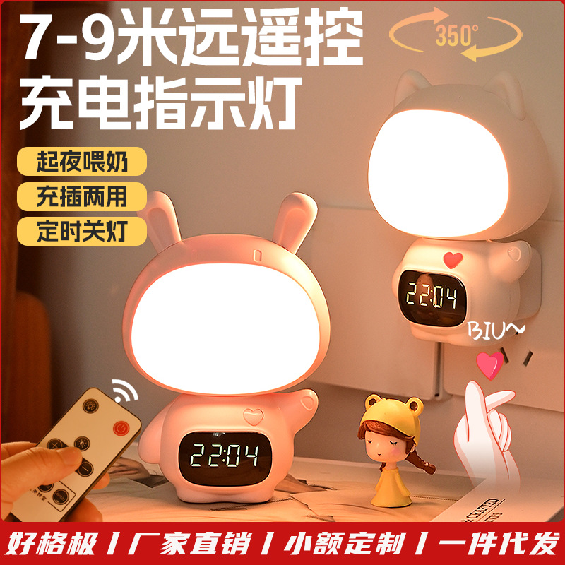 Jam kelinci lucu lampu malam inframerah, kendali jarak jauh colokan pengisian daya penggunaan ganda lampu tidur LED samping tempat tidur multifungsi lampu malam