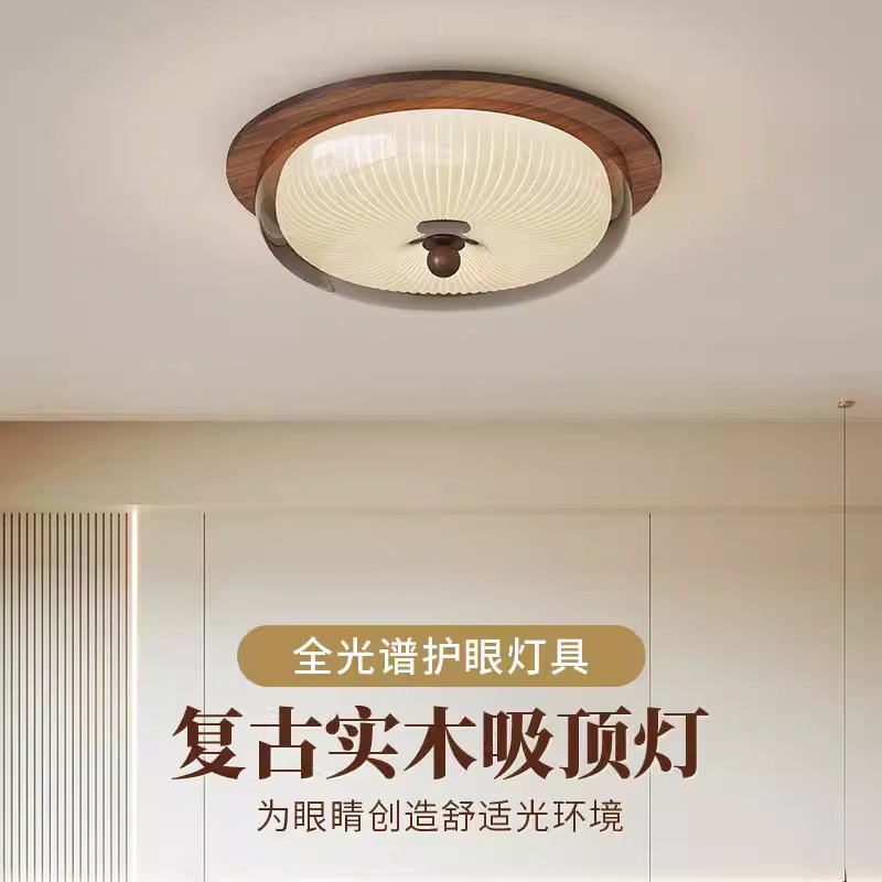 Lampu langit-langit bundar kayu solid Perancis kelas atas kaca ruang tamu warna kayu kenari gaya baru spektrum penuh