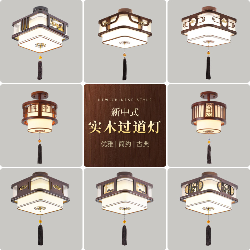 Lampu lorong gaya Cina, lampu langit-langit retro klasik bulat, lampu pintu masuk Zen gaya kayu solid, lampu koridor