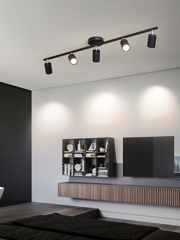 Lampu Sorot jejak tanpa lampu utama, lampu plafon dipasang di permukaan rumah tangga led Nordik latar belakang ruang tamu
