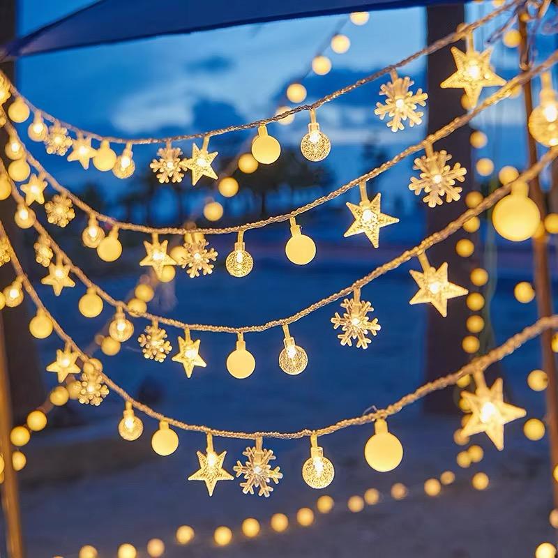Dekorasi Natal tali cahaya berwarna led langit berbintang Tahun Baru kepingan salju festival luar ruangan cahaya bintang tata letak Tahun Baru terang