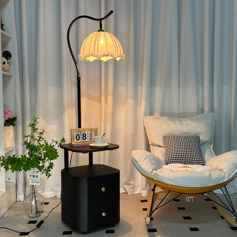 Lemari Samping Tempat Tidur Gaya Perancis Lampu Lantai Lantai Rak Kayu Solid Lampu Meja Vertikal Terpadu Lampu Meja Meja Kopi Suasana Kamar Tidur Gaya Pertengahan
