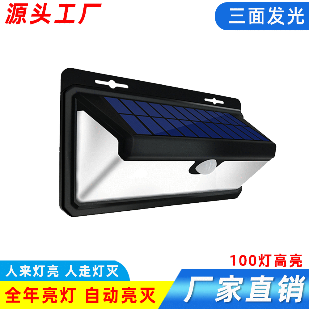Lampu LED induksi tenaga surya, lampu dinding halaman tahan air luar ruangan, lampu induksi tenaga surya 100LED bercahaya tiga sisi daya tinggi terang