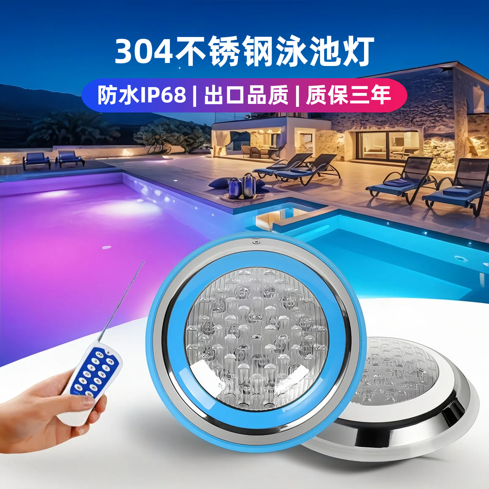 跨境专供led泳池灯挂壁式水下明装不锈钢圆形七彩无线遥控泳池灯