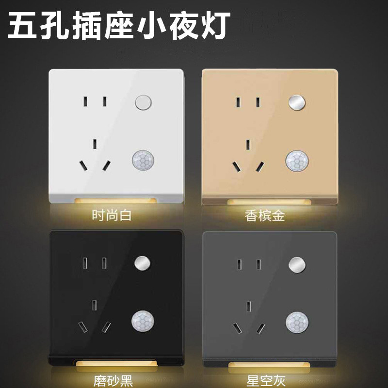 Soket lima lubang dengan sakelar LED, induksi tubuh manusia lampu kaki malam tersembunyi dapat disesuaikan cahaya konstan tangga kamar mandi samping tempat tidur