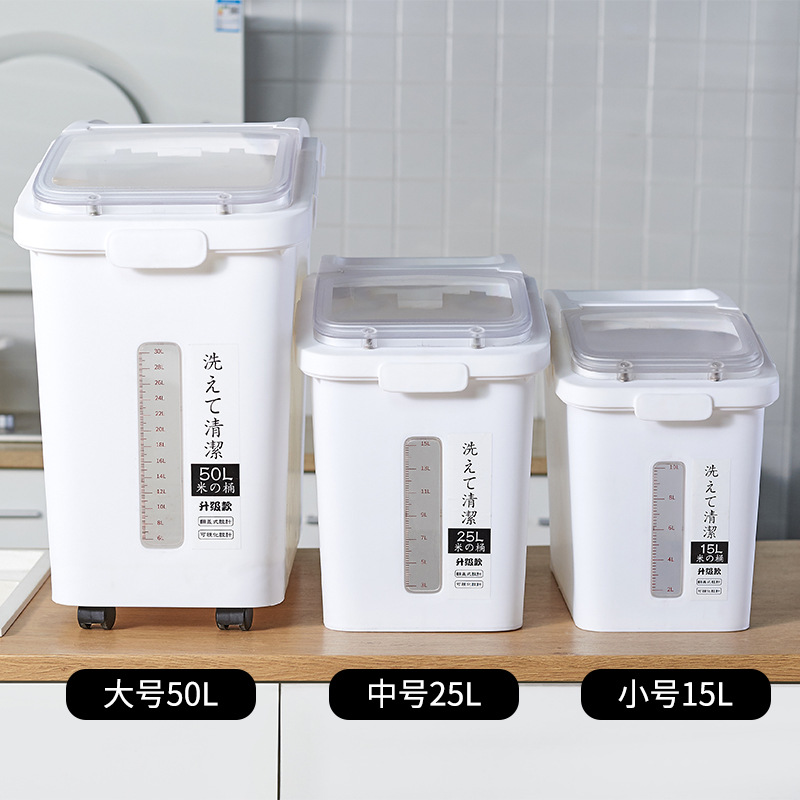 Kotak Penyimpanan Beras Tersegel Tahan Lembab Plastik Gaya Jepang Kapasitas Besar Makanan Kucing Makanan Anjing Tepung Beras Aneka Biji-bijian Ember Beras