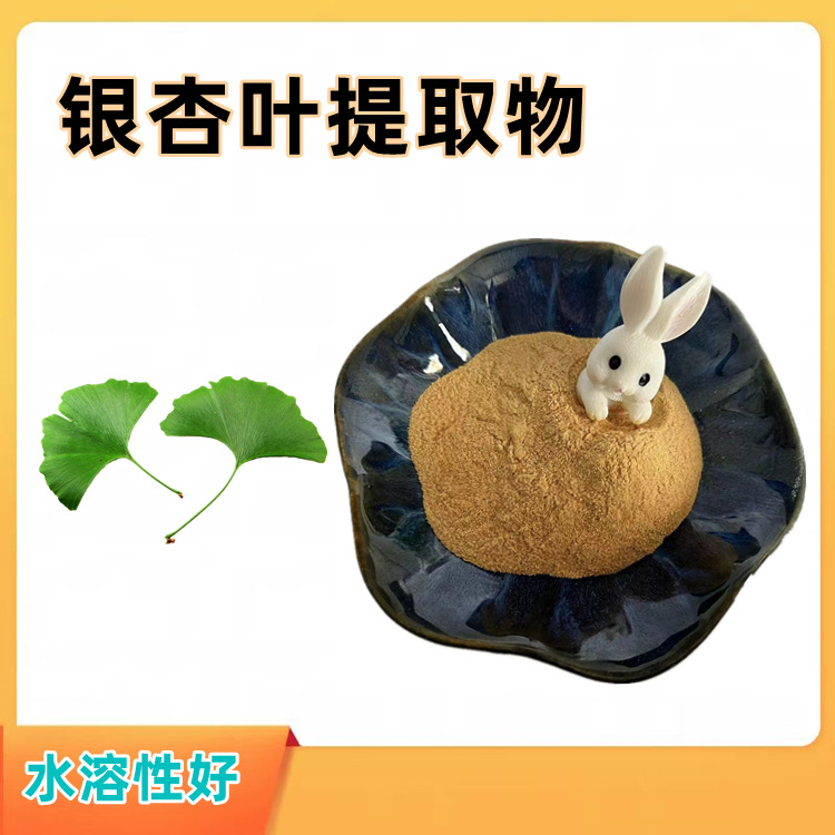 Ekstrak Ginkgo biloba larut dalam air yang baik, jelas dan tembus cahaya, tanpa kotoran, proporsi ekstrak coklat kuning bubuk halus