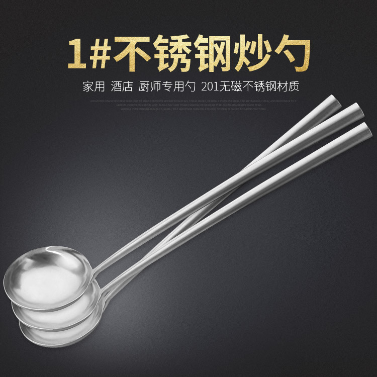 Sendok penggorengan baja tahan karat No. 1, grosir sendok penggorengan makanan koki perlengkapan hotel sendok minyak besar sendok sup