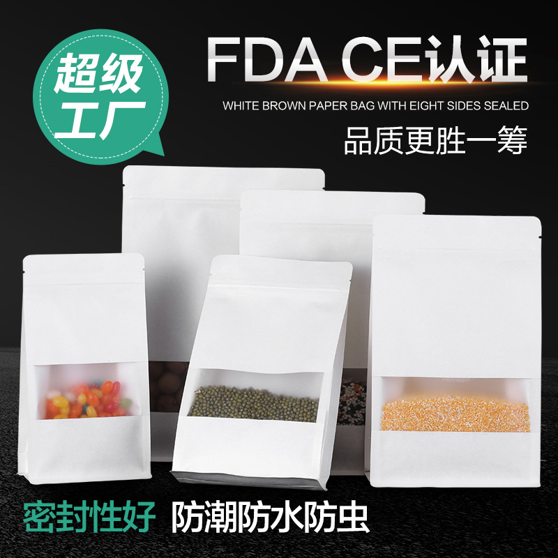 Jendela transparan putih kantong penyegel delapan-sisi kertas Kraft kacang makanan ringan kantong penyegel delapan-sisi kantong kemasan teh berdiri sendiri