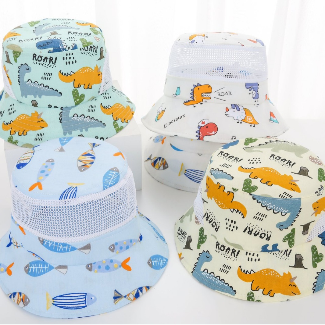 Topi nelayan anak musim semi dan musim panas topi jala dinosaurus kartun baru topi pelindung matahari luar ruangan anak laki-laki dan perempuan batch pabrik