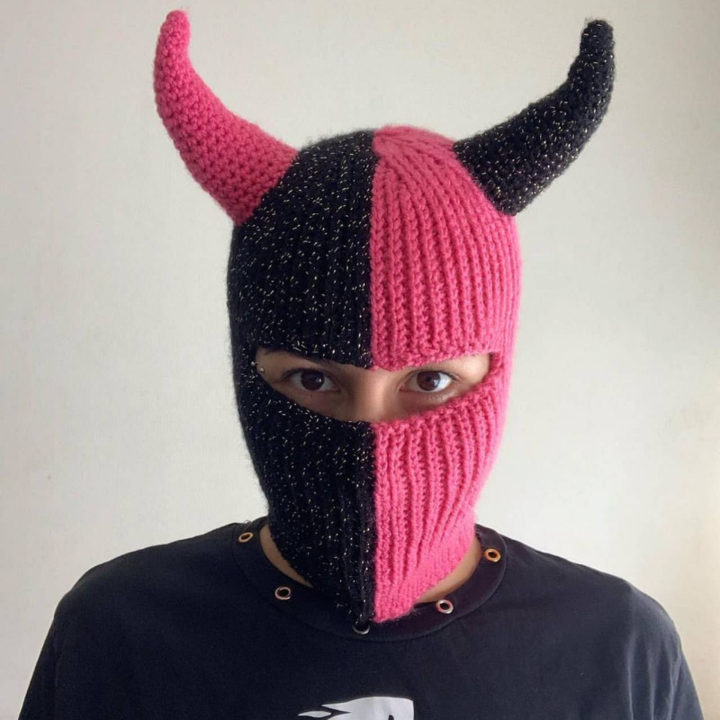 Tutup kepala rajut buatan tangan, 24 tahun buatan tangan Halloween masker tanduk lucu musim dingin hangat dewasa