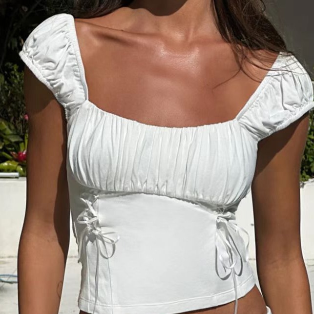 2023 Amazon quick buy atasan lengan pendek warna polos bahu tali pinggang sisi berlipat dada tertutup