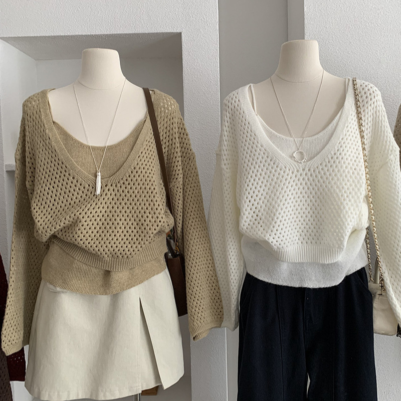 欧玛莱 早秋吊带修身针织打底+镂空休闲长袖V领毛衣两件套女 5163