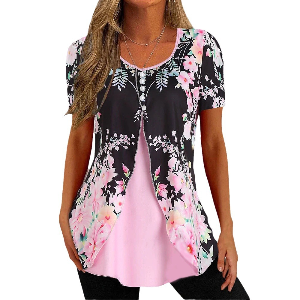Kaus lengan pendek dengan kancing dua potong palsu leher bulat motif bunga wanita baru musim panas Temu Amazon Eropa dan Amerika Cross-border