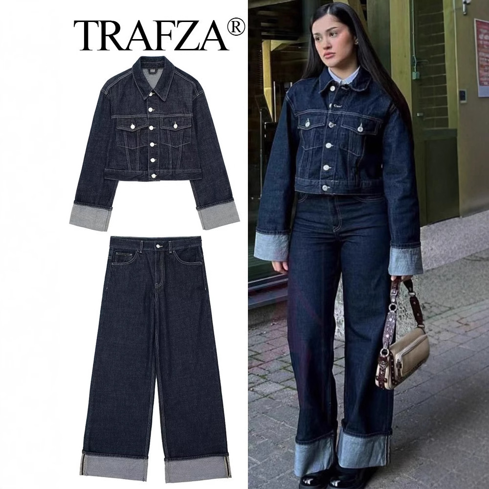 TRAFZA Setelan Jaket Denim Retro Wanita Jaket Lengan Panjang Kancing Satu Bit Celana Jeans Pinggang Tinggi Kaki Lebar