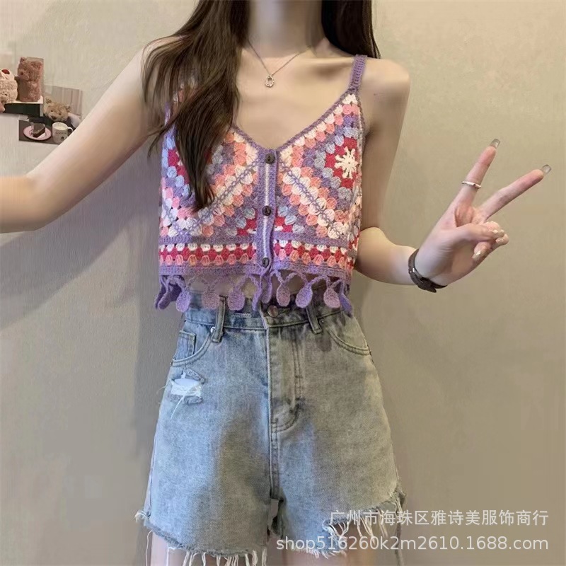 Kamisol rajut berongga bordir chic Perancis atasan pendek musim panas wanita baru luar ruangan gaya liburan gaya wanita