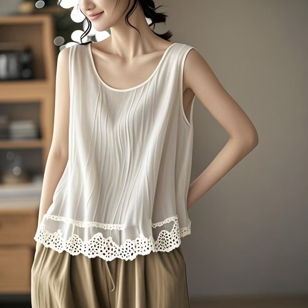 Tank Top Tali Pinggul Renda Katun Linen Katun Murni Pakaian Luar Wanita Musim Semi Musim Panas 2025 Ukuran Besar Wanita Menutupi Perut Tanpa Lengan Kemeja Boneka