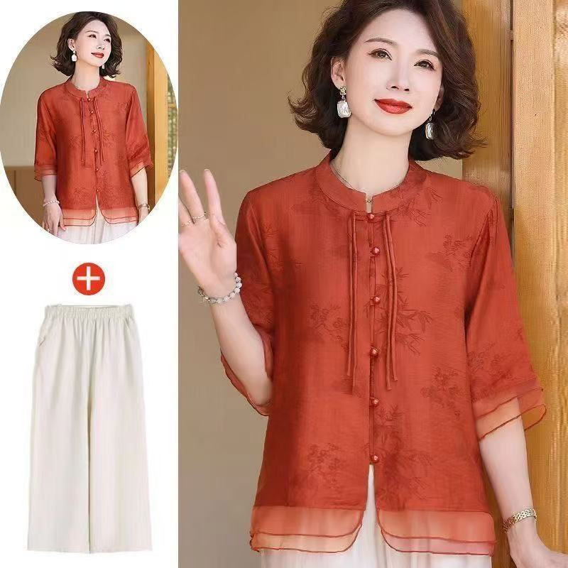 Setelan Musim Panas Ibu Setengah Baya Kemeja Lengan Pendek Gaya Tiongkok Atasan Kemeja Gaya Barat Modis Setelan Dua Potong Wanita Setengah Baya