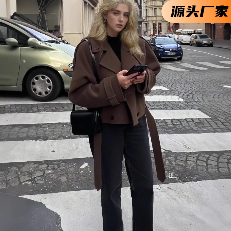 Pakaian Wanita Perbatasan Eropa dan Amerika Perdagangan Luar Negeri Jaket Wol Wanita Musim Gugur dan Musim Dingin Mantel Wanita Lengan Panjang Bertali Kepribadian Mantel Jaket Wanita