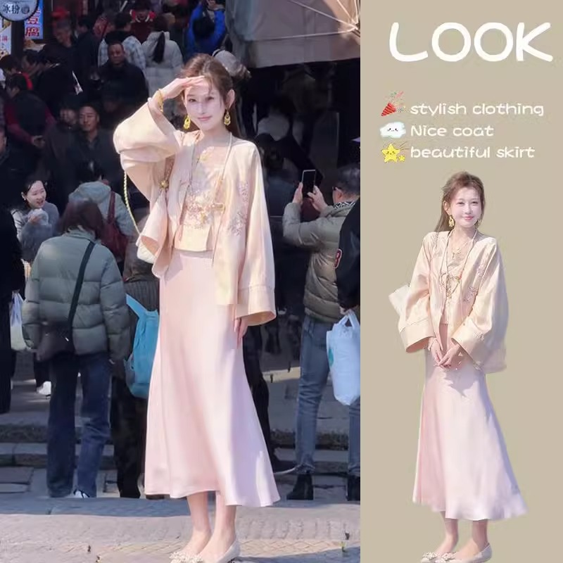 Setelan Wanita Gaya Cina Baru Gaya Cina Modis Musim Semi Model Baru Rok Sling Elegan Berkualitas Tinggi Set Tiga Potong