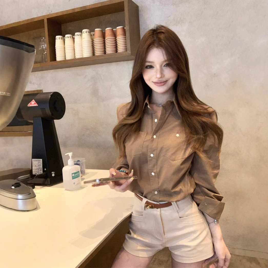 RHGD Foto Padat 2025 Kemeja Lengan Panjang Retro Warna Khaki Kemeja Kerah POLO Wanita Celana Pendek Kasual Pinggang Tinggi Celana Huruf A