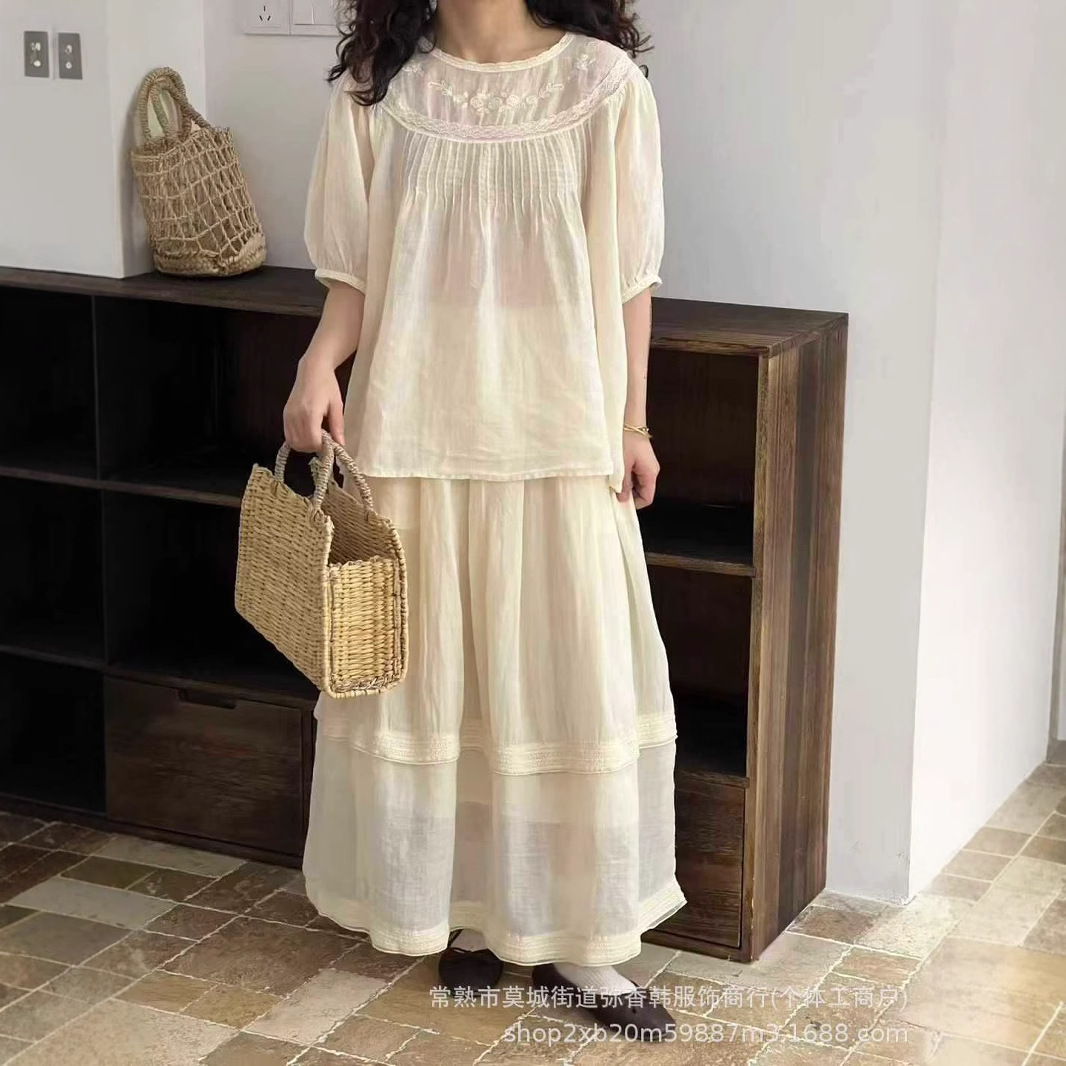 Kemeja Ramie Kombinasi Renda Kerah Persegi Sastra dan Seni Rok Setengah Badan Ramie Terlihat Kurus Mudah Dipadu Padan Gaya Jepang Set Modis