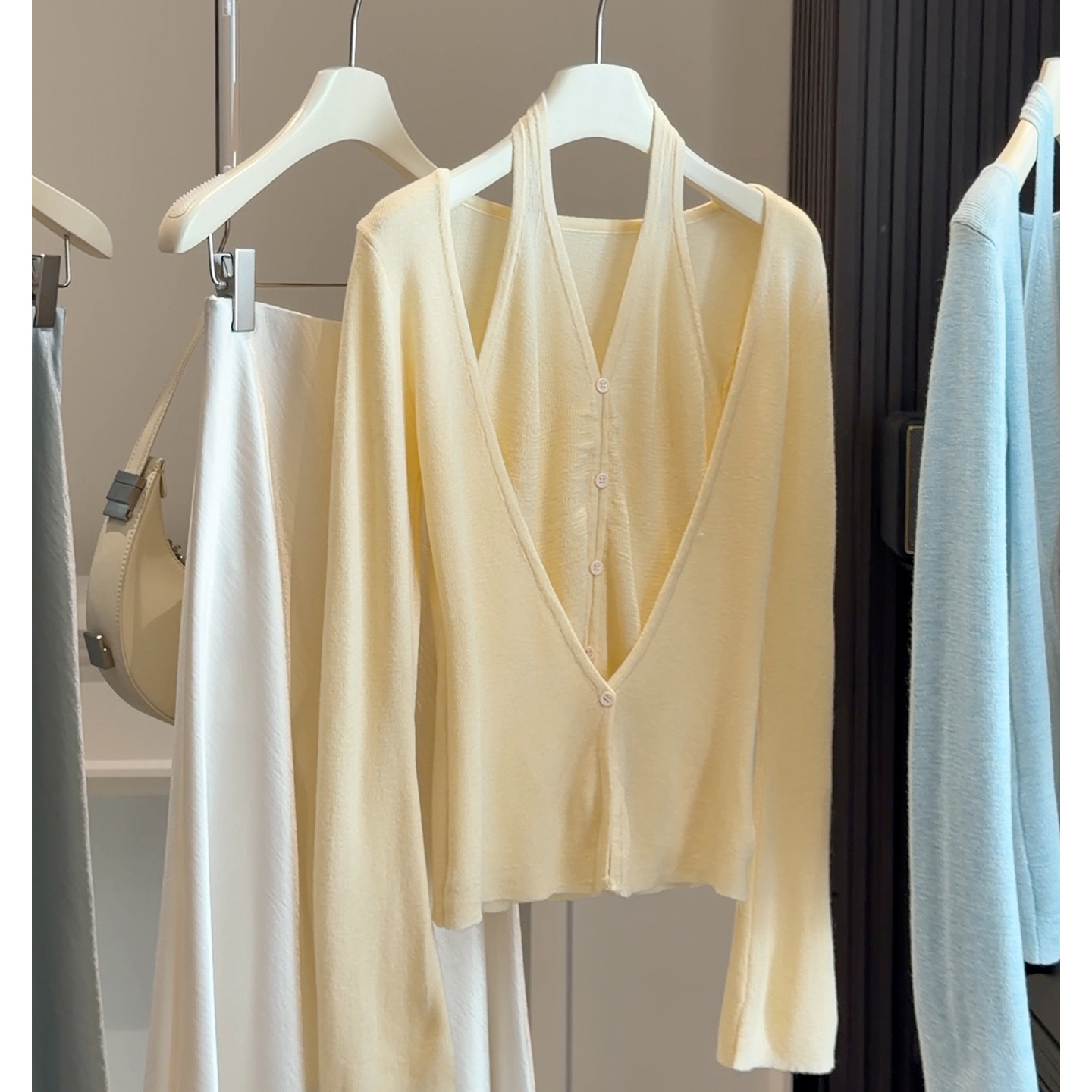 设计感挂脖V领性感纽扣假两件针织衫女春季气质修身百搭长袖上衣