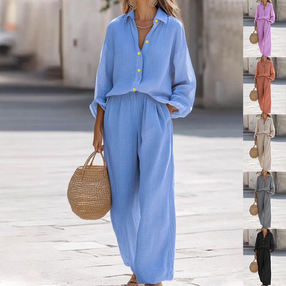 2025 Pakaian Wanita Baru Lintas Batas Perdagangan Luar Negeri Kemeja Lengan Panjang Kasual Kerah Terbalik Celana Panjang Setelan Wanita Katun Multicolor