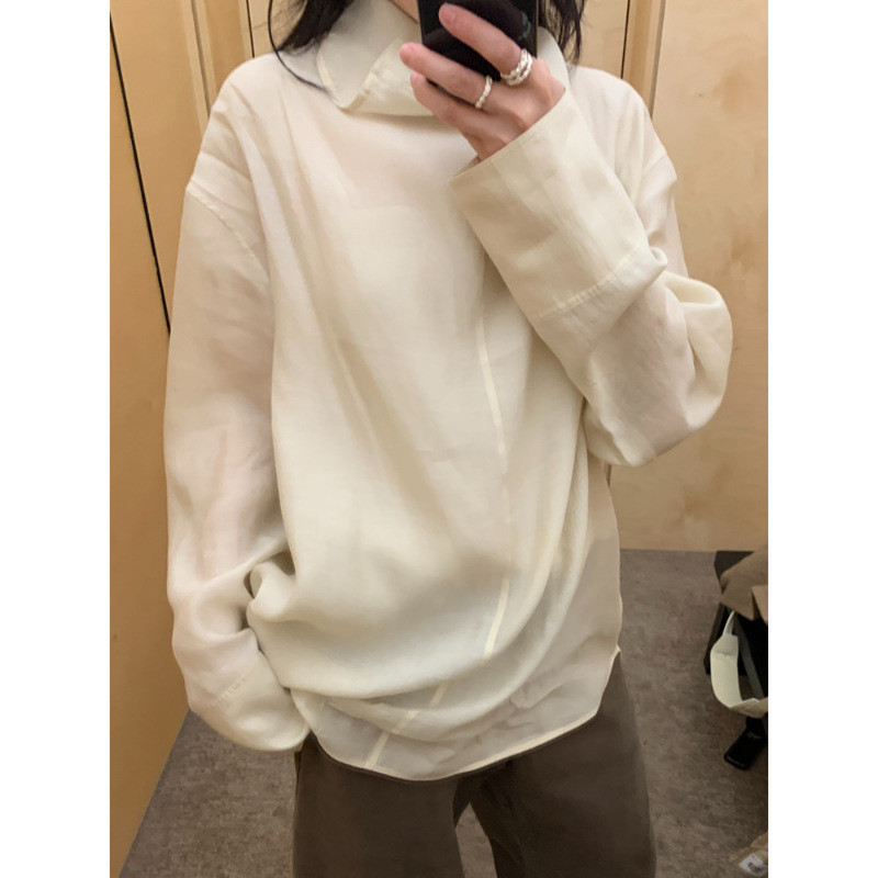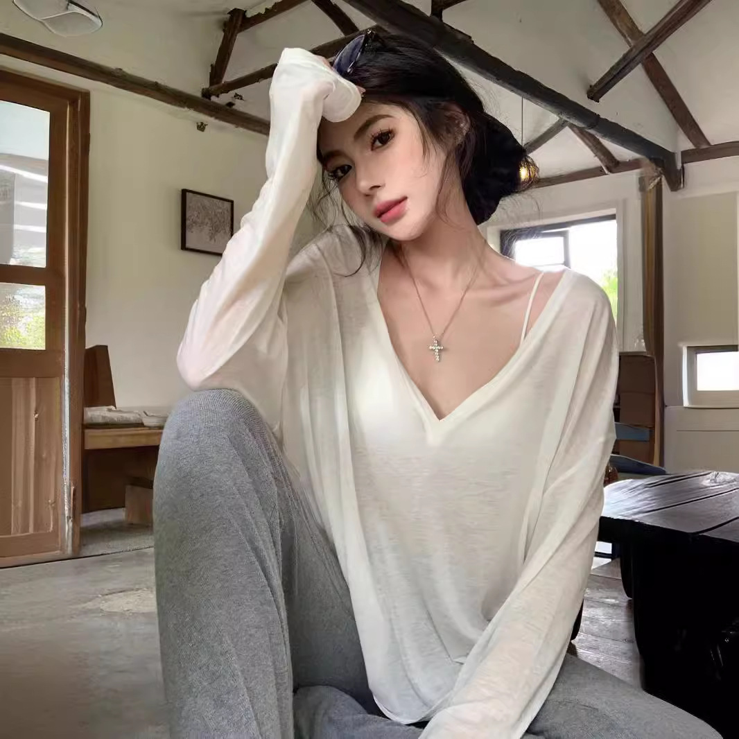 白色薄款微透v领长袖T恤女装夏季宽松防晒罩衫气质休闲打底衫上衣