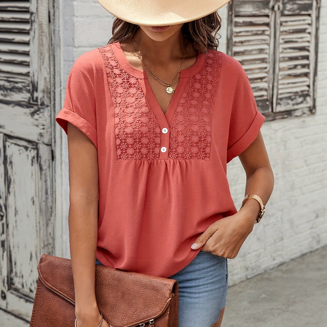 2025 Wanita Ukuran Besar Renda yang Larut dalam Air Sambungan Kain Lipit Berhiasan Kancing Kerah V Lengan Pendek Longgar Kasual