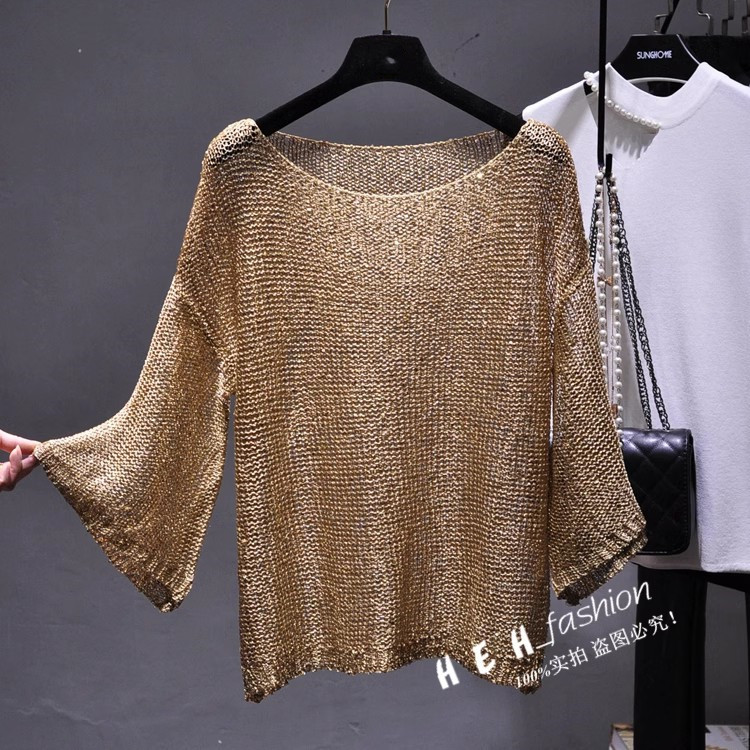 2023 musim gugur baru longgar off-neck payet tipis sweter lengan lonceng ukuran besar berongga perlindungan matahari blus