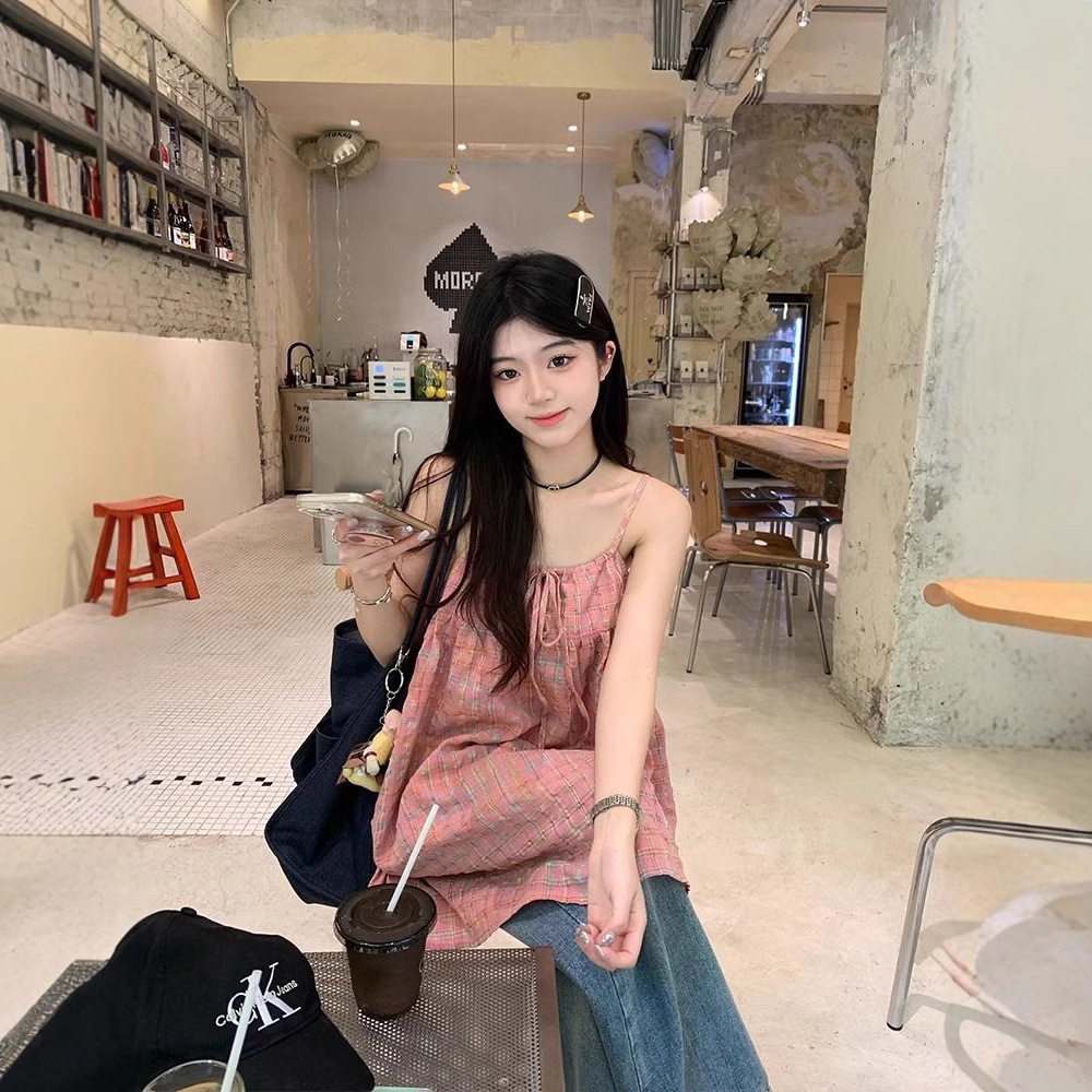 Rompi Tali Bertali Kotak-kotak Warna Kontras Wanita Musim Panas 2025 Model Baru Gaya Korea Longgar Kasual Muda Mudah Dipadu Padan Atasan Trendi
