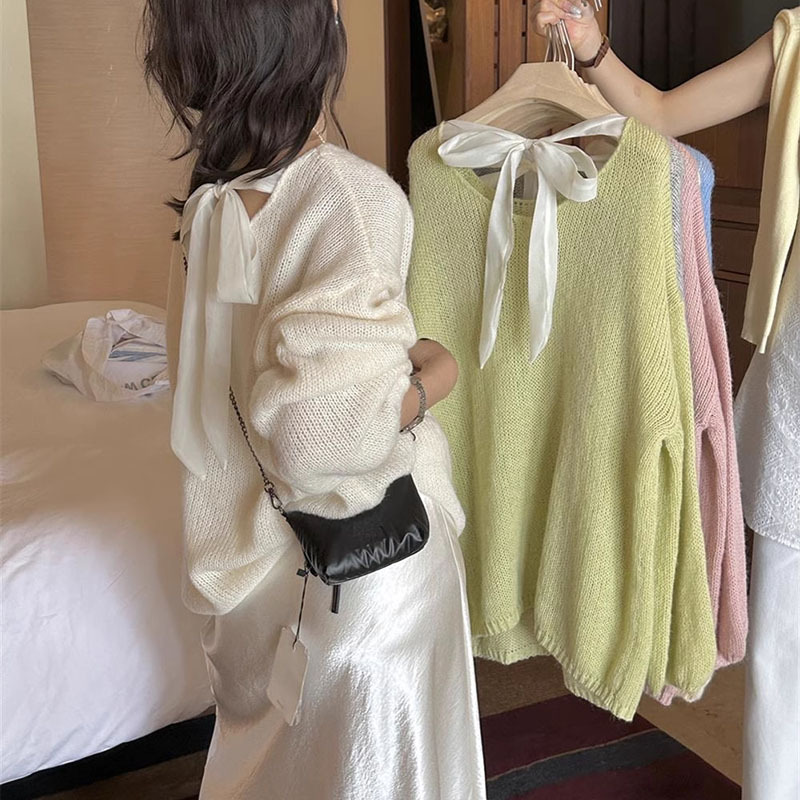 Pakaian Musim Semi 2025 Sweater Tipis Pita Kupu-Kupu Tali Setelah Versi Korea Sweater Wanita Longgar Gaya Malas Sweater Blus Berongga Sedikit Transparan