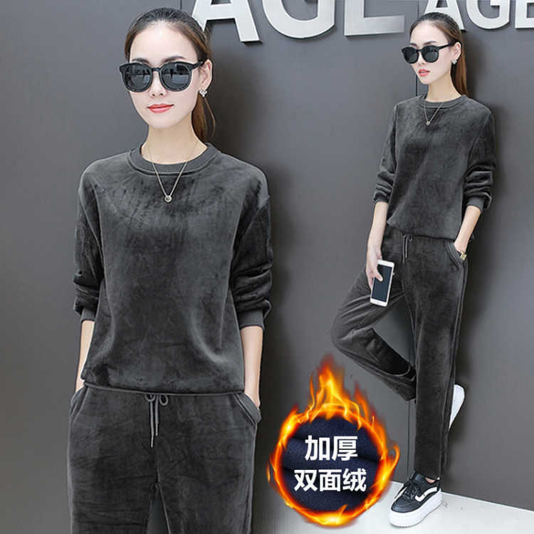 Setelan Beludru Emas Warna Solid Model Baru Setelan Olahraga Beludru Dua Sisi Model Baru Musim Gugur dan Musim Dingin Sweater Ditambah Beludru Ditambah Tebal Setelan Dua Potong