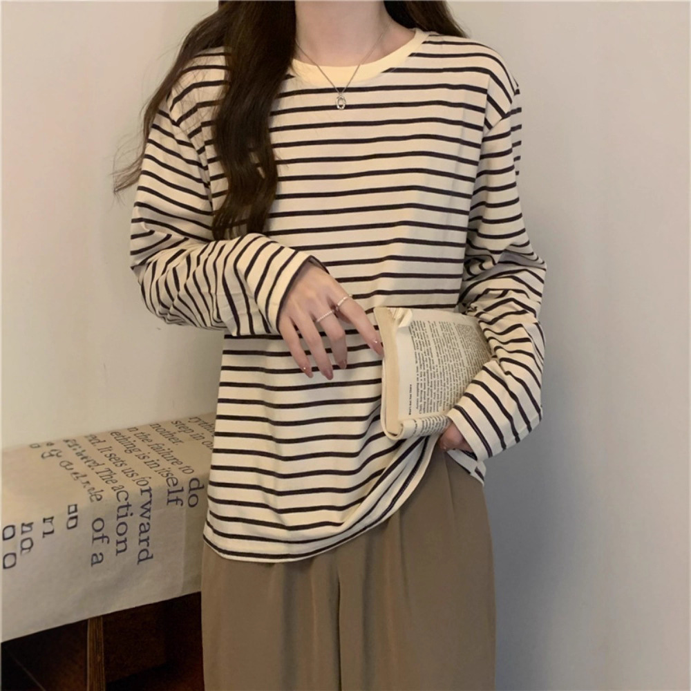 Kaos wanita lengan panjang kerah bulat model baru musim gugur 2025, longgar, ramping, serbaguna, motif garis, atasan kasual untuk dalaman