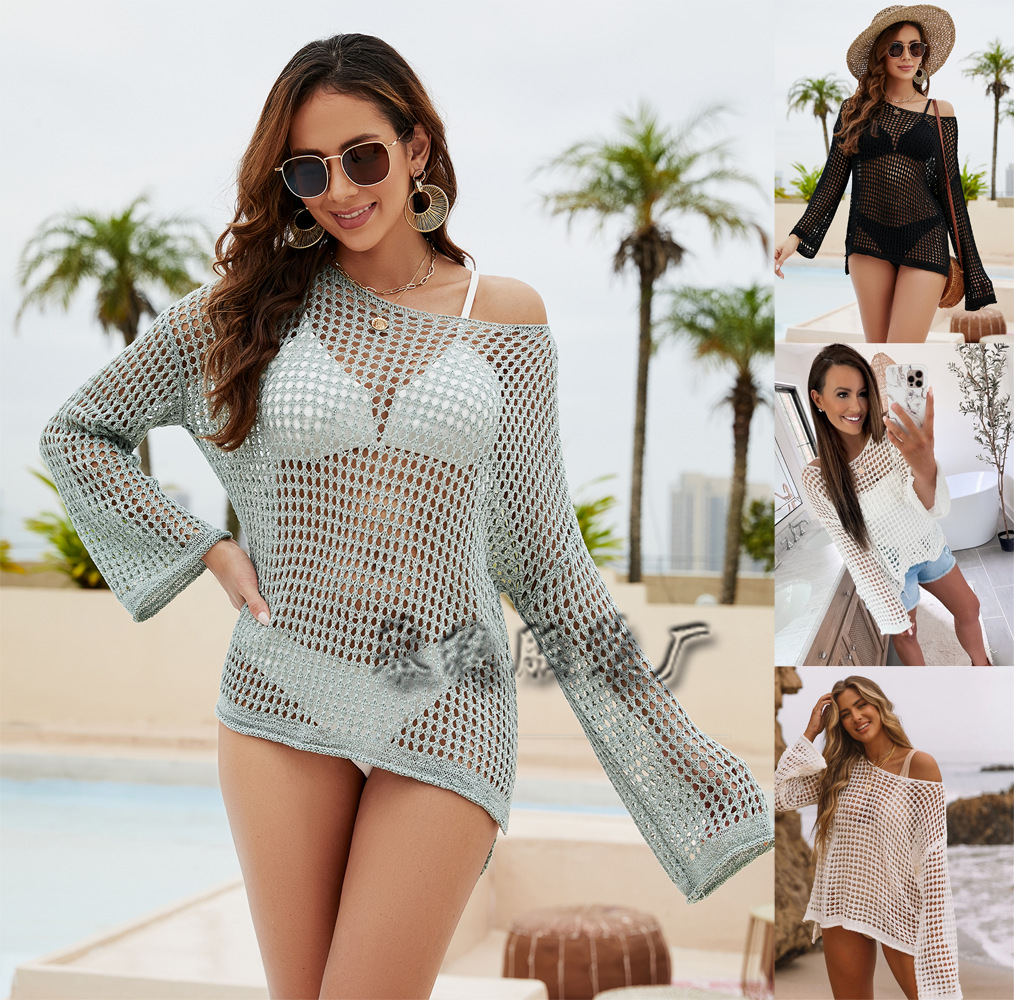 2023 musim semi dan musim panas lintas batas pakaian rajut Eropa dan Amerika lengan lonceng longgar sweater wanita perdagangan luar negeri leher bulat pakaian rajut wanita berongga