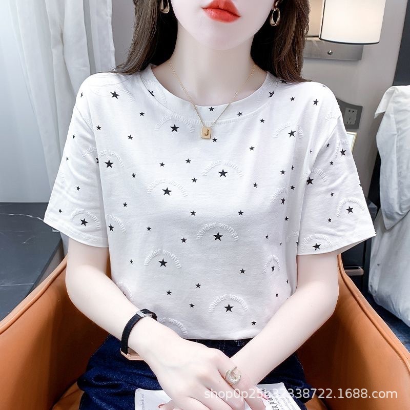 Kaos katun putih murni lengan pendek untuk wanita, model longgar musim panas, atasan bahu reguler motif baru 2025, fashion wanita Korea Qingdao.