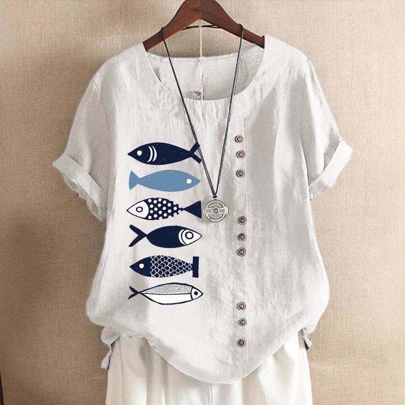 Real shot 2024 musim semi dan musim panas baru Amazon wish AliExpress ukuran besar wanita cetak katun dan linen kemeja kasual lengan pendek
