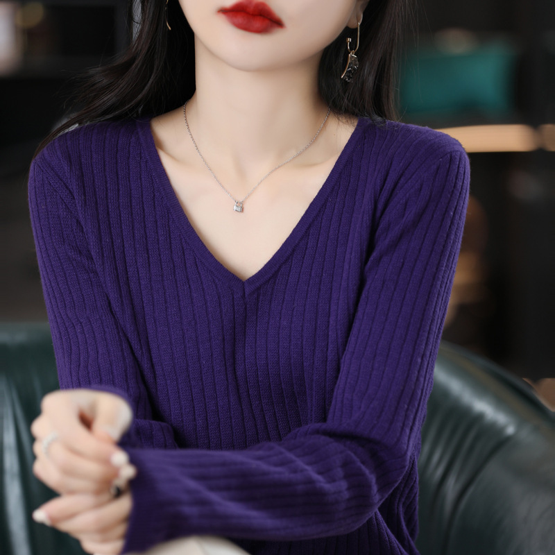 Pulover wanita rajut katun combed, baju Dalaman lengan panjang leher V, warna solid serbaguna pendek, baju Dalaman gaya Barat