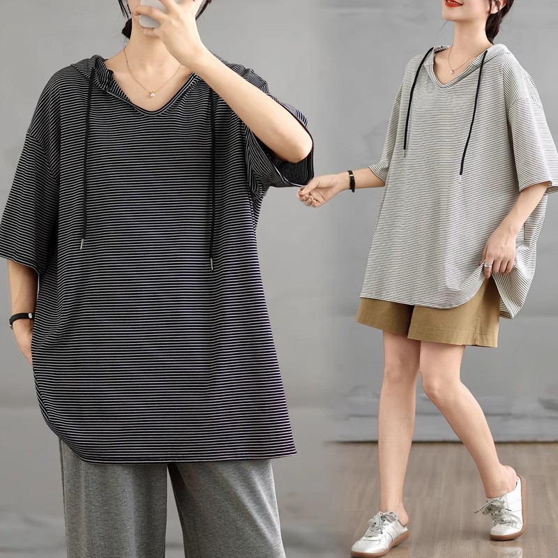 T-shirt Pakaian Wanita Ukuran Besar T-shirt Lengan Pendek Kasual Garis Menutupi Perut Longgar Versi Panjang Sedang Bertopi Versi Korea Model Baru Musim Panas