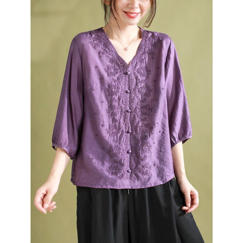 Pakaian Wanita Musim Panas Lintas Batas Bordir Retro Kerah V Lengan Sedang Wanita Paruh Baya Modis Kasual Ukuran Besar Longgar Atasan Ukuran Besar