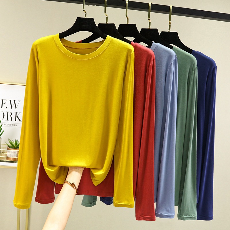 Modal kemeja Dalaman lengan panjang wanita, pakaian dalam ramping warna polos leher bulat ukuran besar musim semi dan musim gugur