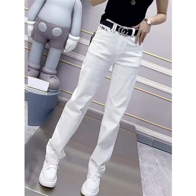 Celana jins panjang lurus untuk wanita, celana jins panjang elastis ukuran Plus, celana pel kaki lebar tipis pelangsing pinggang tinggi musim gugur dan musim dingin ukuran ekstra besar untuk wanita