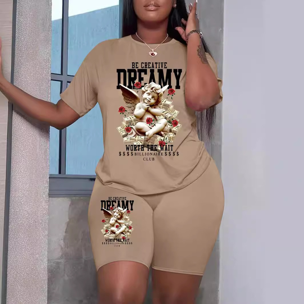 Setelan pakaian olahraga wanita, setelan dua potong kasual leher bulat lengan pendek cetak impian Amazon musim gugur dan musim dingin