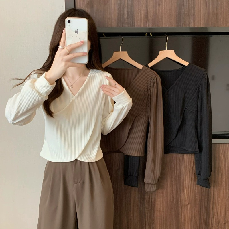 Kemeja Dalaman modis kerah V untuk wanita, atasan lengan panjang ramping tidak beraturan pakaian dalam musim gugur dan musim dingin baru 2023