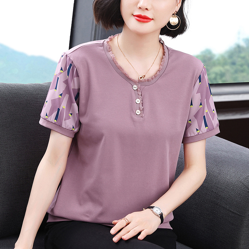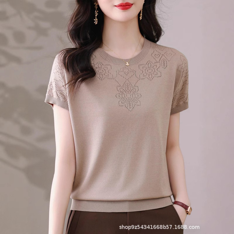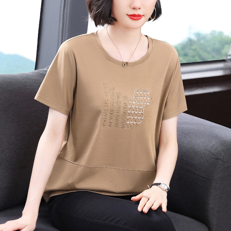 Kaus Musim Panas Ibu Setengah Baya Kaus Kecil Pakaian Wanita Gaya Barat Modis Model Baru Atasan Lengan Pendek Longgar Ukuran Besar Sutra Es Menutupi Daging