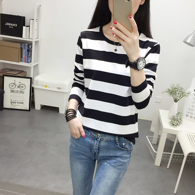 Kaos lengan panjang wanita musim semi dan gugur 2025, atasan longgar ukuran besar untuk ibu paruh baya, atasan garis-garis awal musim gugur.