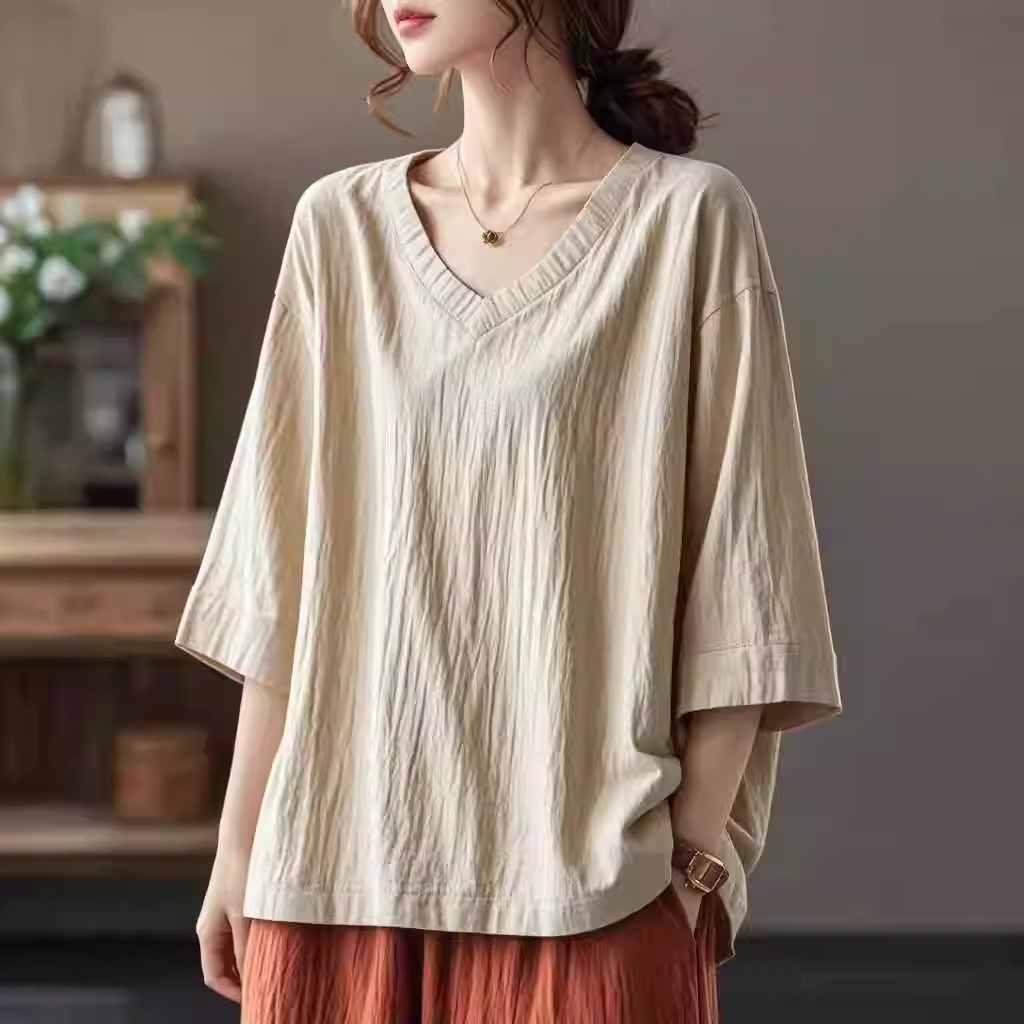 T-Shirt Model Baru Musim Panas 2025 T-Shirt Kerah V Lengan Setengah Ukuran Besar Mudah Dipadu Padan Longgar Atasan Seni Gadis Gemuk Kaus Dalaman Wanita
