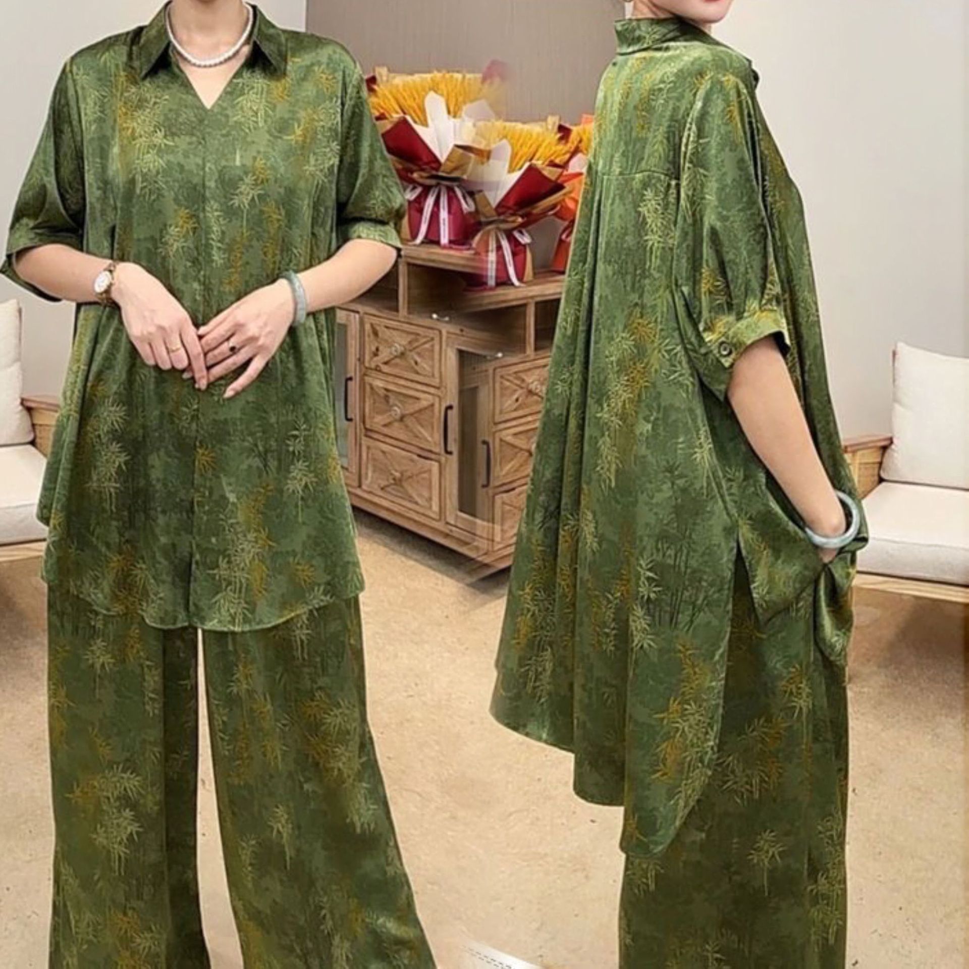Setelan Modis Ibu Ukuran Besar Kelas Atas Musim Panas Longgar Terlihat Kurus Mengurangi Usia Lengan Lima Perempat Atasan Celana Lurus Setelan Dua Potong