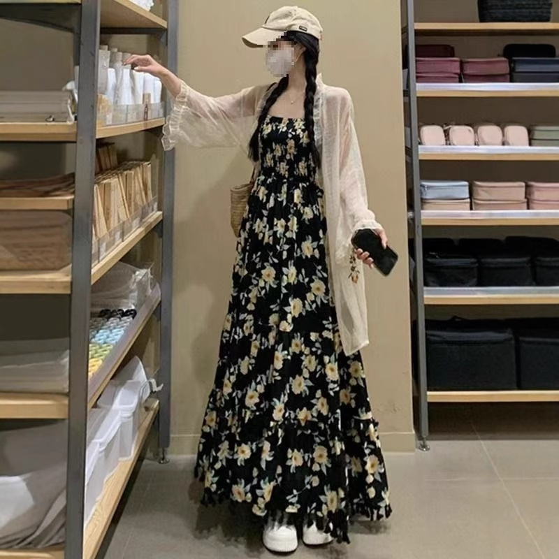 Set Gaun Bertali Bunga Warna Hitam Ukuran Besar Gaun Kardigan Wanita Model Tipis Liburan Gadis Gemuk Musim Panas Set Dua Potong